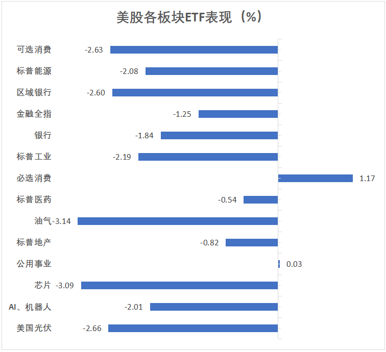 美股行业ETF普跌。全球航空业ETF收跌3.97%,半导体ETF跌3.03%,网络股指数ETF、科技行业ETF,可选消费ETF、区域银行ETF、全球科技股指数ETF、银行业TF、能源业ETF跌2.8%-2.08%,医疗业ETF跌0.54%,生物科技指数ETF跌0.37%,日常消费品ETF则收涨1.17%。
