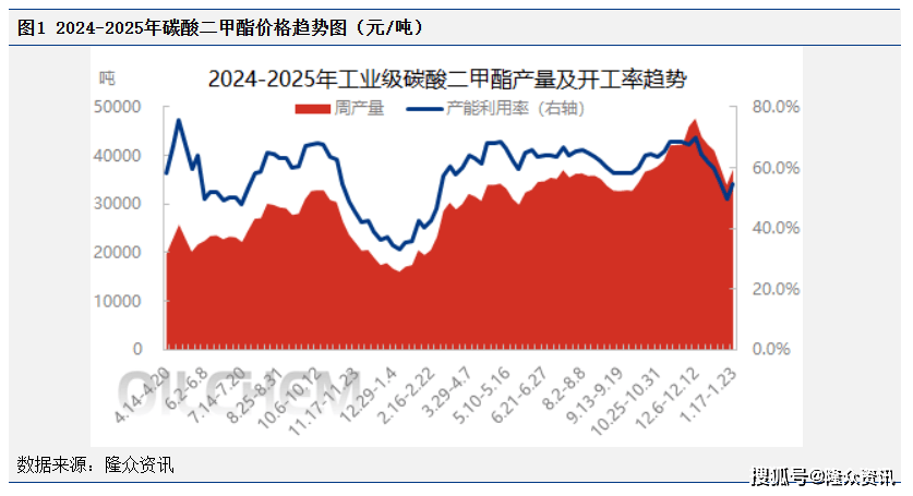 据隆众调研,2025年春节期间,国内碳酸二甲酯产量及重交碳酸二甲酯开工负荷均处于低水平,供应处于宽松的特征。