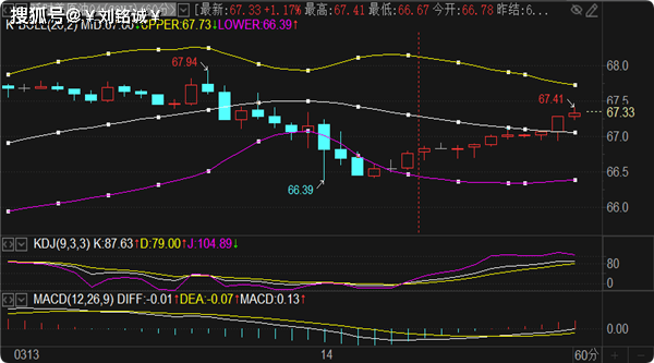 2、低位触及66做多,向下相隔5个点补仓,破64.5止损,目标68-70,破位持有;