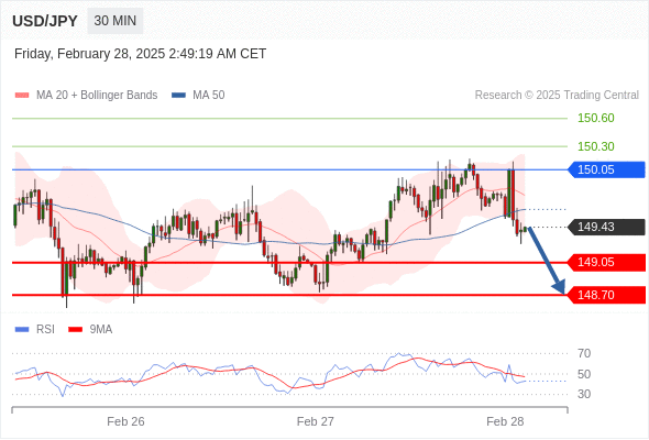 在 150.05 之下,看跌,目标价位为 149.05 ,然后为 148.70 。