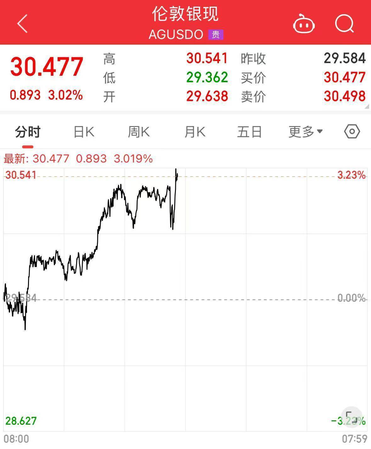 现货黄金、白银快速拉升,伦敦金现上涨2.79%,伦敦银现涨超3%。